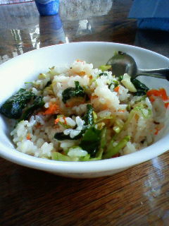 しおびき、ほうれん草のお浸し、千切りキャベツが残ってたので、チャーハンにした。